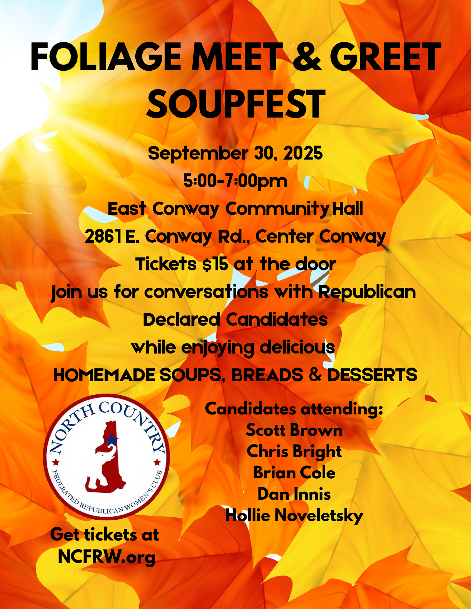 Join us on September 30, 2025 from 5:00 PM – 7:00 PM for conversations with Republican declared candidates while enjoying delicious homemade soups, breads and desserts. You will meet Chris Bright, Scott Brown, Brian Cole, Dan Innis, and Hollie Noveletsky.